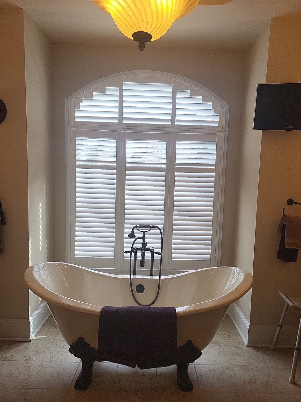 Bathroom with bathtub, shower, window with shutters, and weight scale.