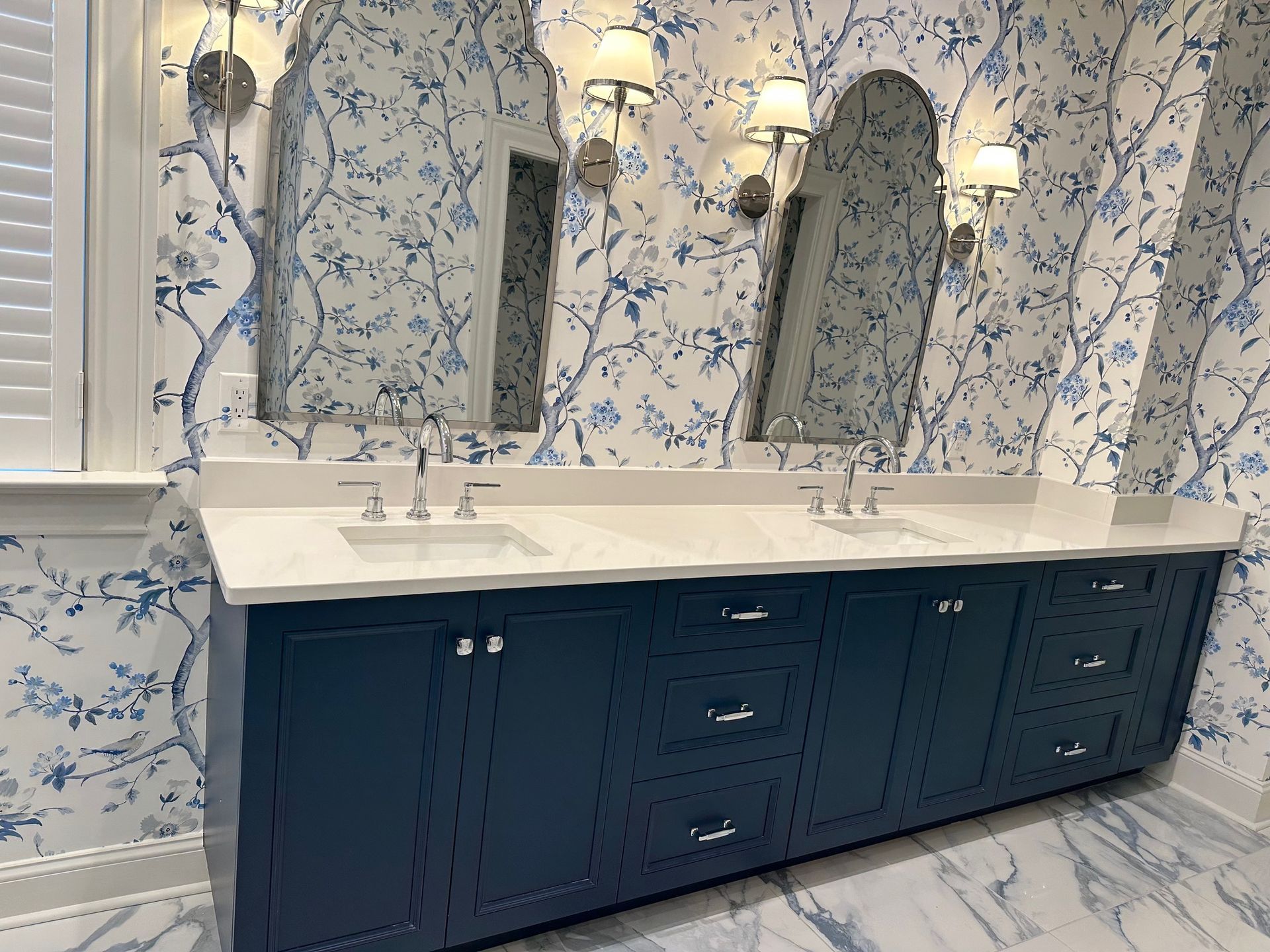 Bathroom with blue floral wallpaper, white countertops, dark blue cabinets, marble floor.