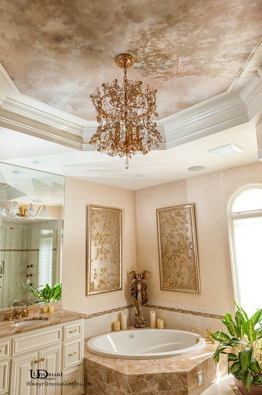 Bathroom with built-in jacuzzi, ornate columns, and zebra-style window shade. Beige and white tile, pendant light.