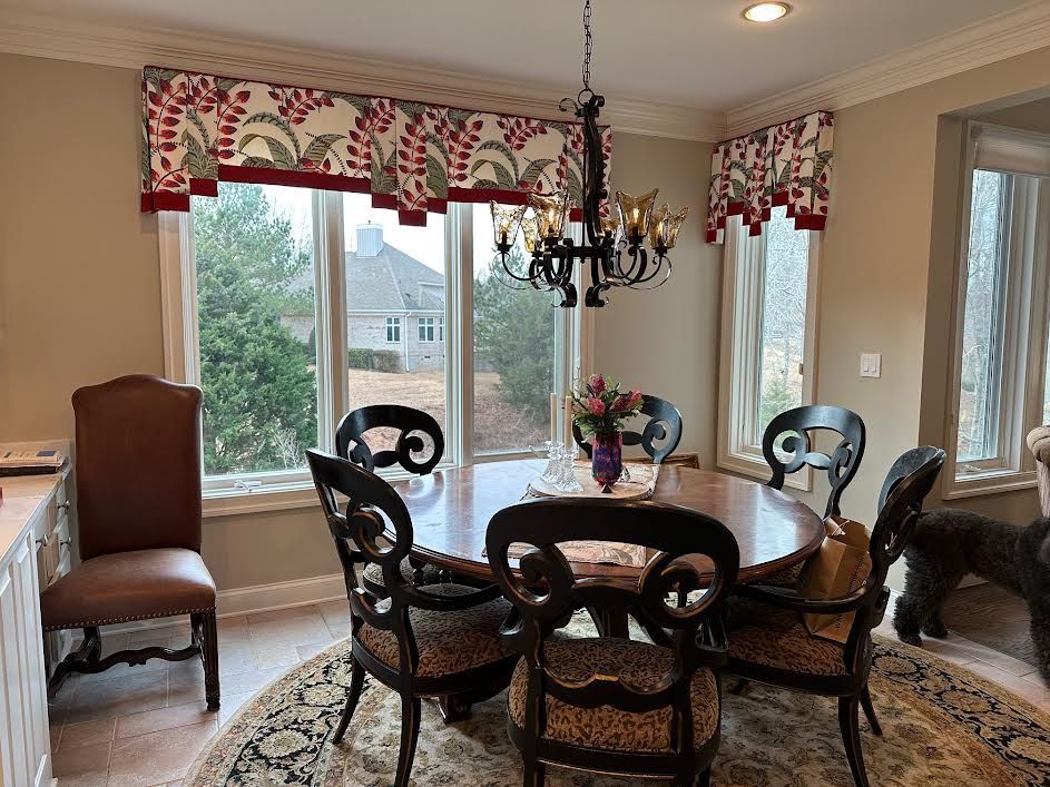 Breakfast nook with round table, four chairs, and geometric pattern valances. Large windows overlook backyard.
