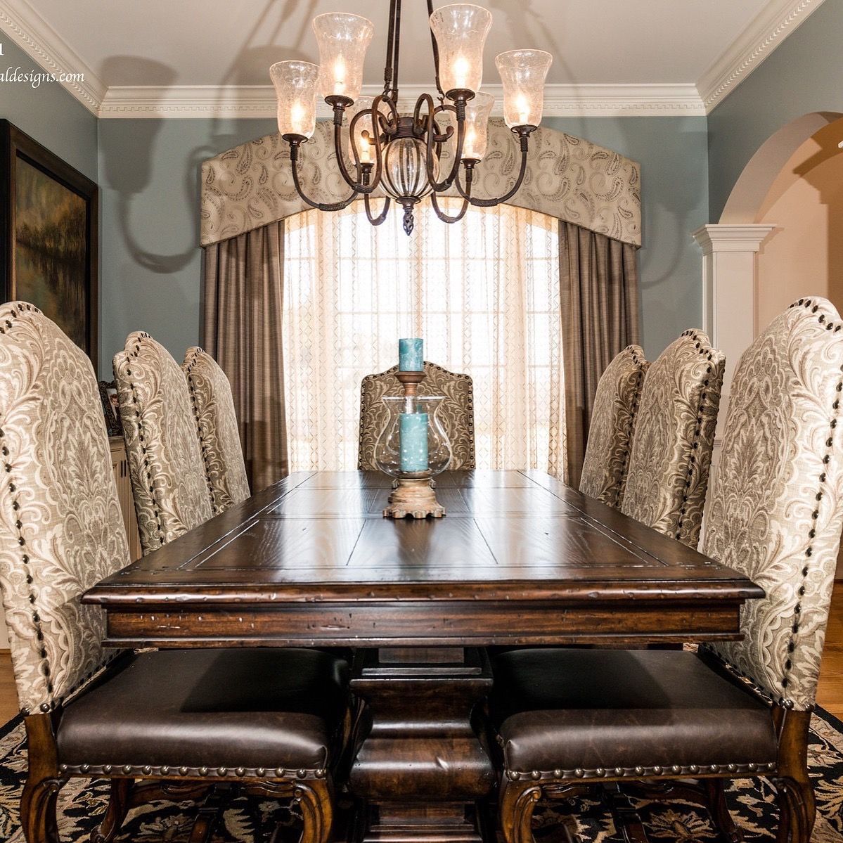 Elegant dining room with red drapes, chandelier, and a long wooden table set for six.