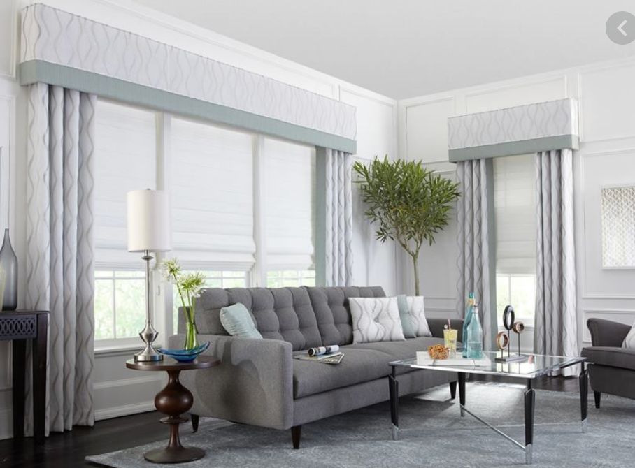 Two windows with ornate gold and black drapery, flanked by white ceiling fans, in a living room.