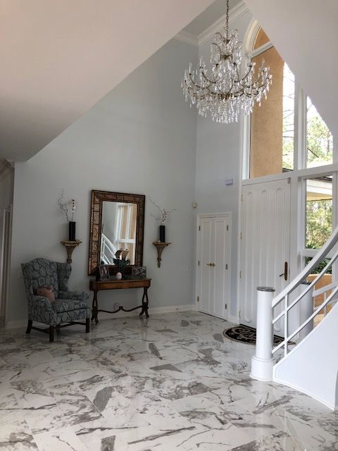 Living room with sofa, chair, ottoman, and sheer curtains. Gold chandelier hangs from ceiling.