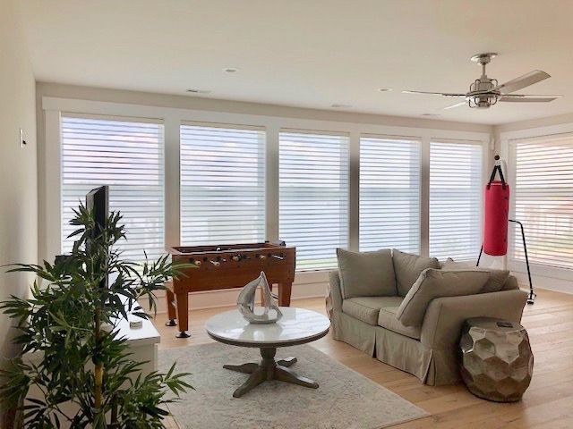 Sunroom with sheer window coverings, small table, chairs, sofa, and ottoman.