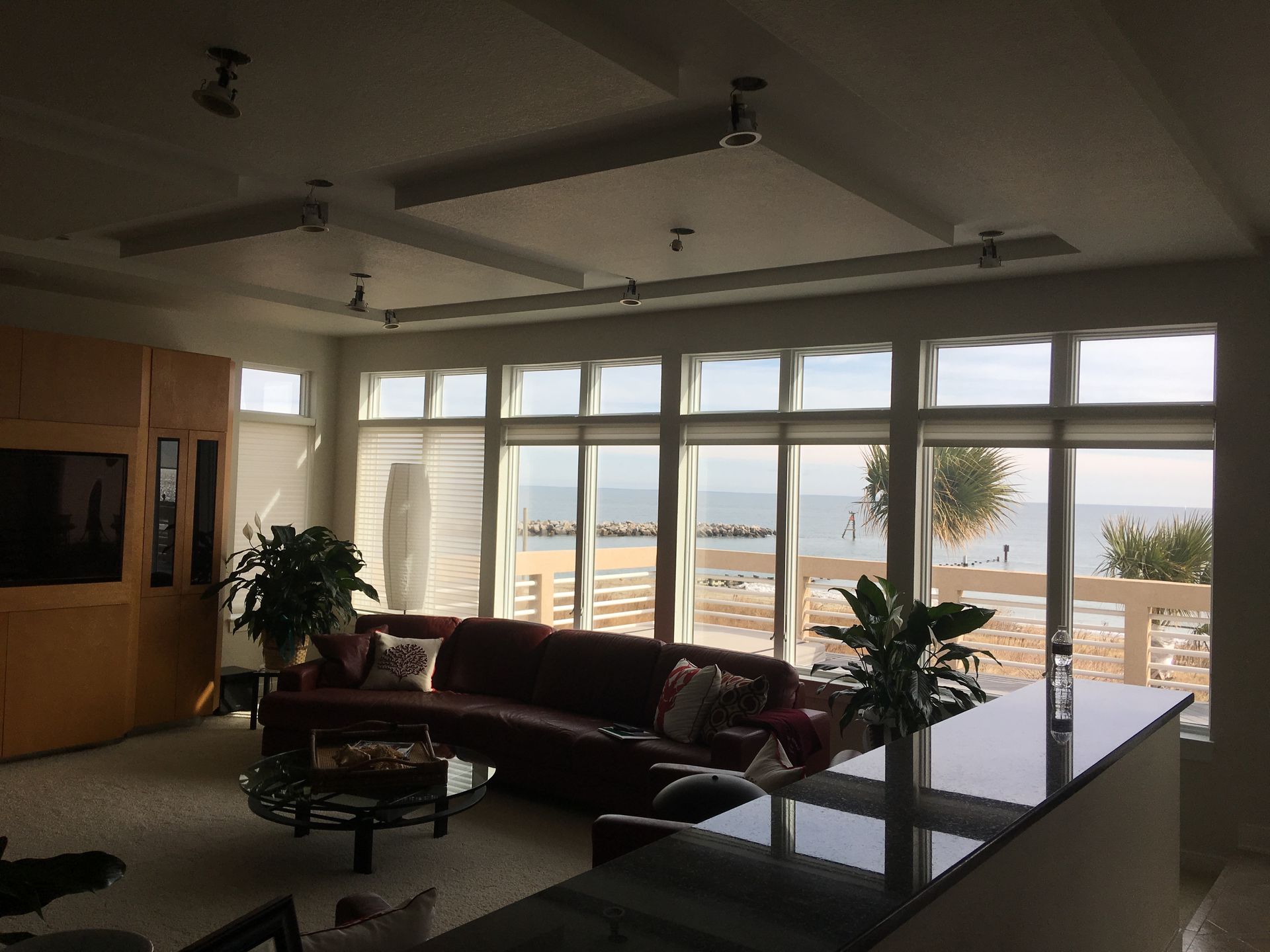 Living room with a white sectional sofa, large windows overlooking a lake, and a chandelier.