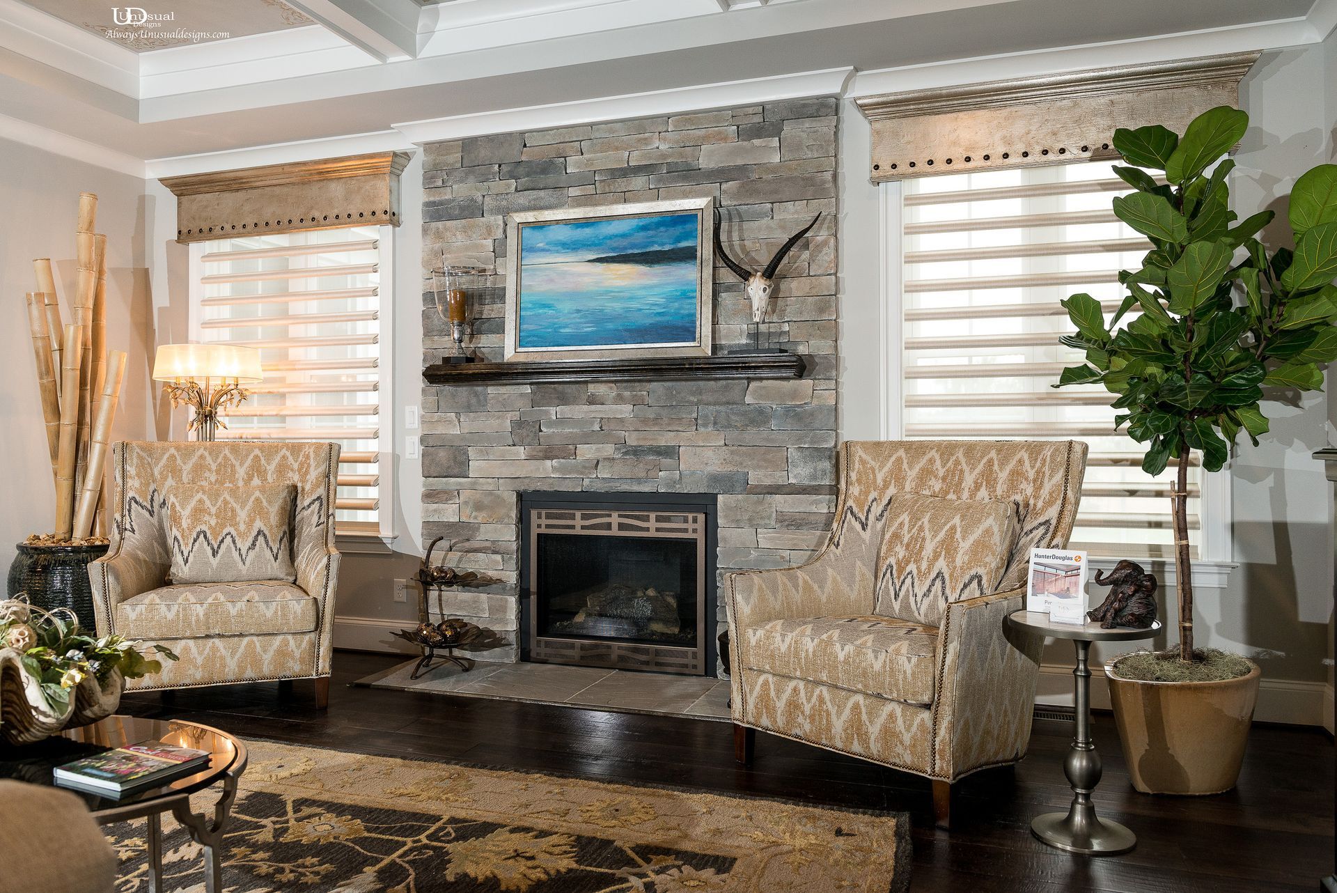 Living room with high ceilings, large windows, and a stone fireplace. Furnishings include a sofa, chairs, and a dining table.